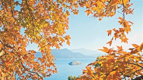 接着风来了,红色的枫叶飘洒下来,旋转、飞舞、回荡,落在肩头、落在脚边,提醒着你珍惜眼前。擦擦脸、伸伸腰、穿林踏叶继续前行。满目缤纷中透出了一片蓝,再向前去便已到岛的另一侧。抬望眼,水光潋滟,湖水潺潺不息;天朗气清,远山缥缈无影,绮丽的风景尽在眼前。