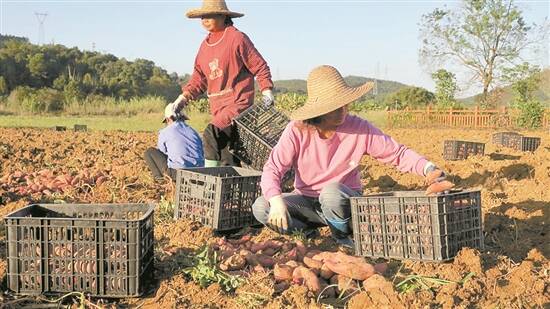 据介绍,为了提高农产品品质,该村选择种植优质香蜜薯品种。香蜜薯个头大、口感好,供不应求。东山村党支部书记周新彬告诉记者:“香蜜薯亩产1500公斤,预计总产量15万公斤,每天能收30亩左右。”目前,东山村香蜜薯采收即将结束,香蜜薯主要按照订单点对点销往珠三角地区,很少经过中间流通渠道,价格比较稳定,一般在2元/斤左右。