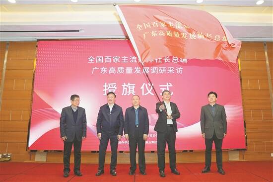 调研采访活动的授旗仪式20日在广州举行。中国晚协会长刘海陵将写有“全国百家主流媒体社长总编广东高质量发展调研采访”字样的红旗,传递给羊城晚报报业集团(羊城晚报社)党委书记、社长杜传贵,中国晚协执行会长、新民晚报社原社长朱国顺,乌鲁木齐市委宣传部副部长、乌鲁木齐晚报社党委书记张培峰,深圳报业集团副总编辑、深圳晚报总编辑叶晓滨,宣告调研采访活动正式开启。