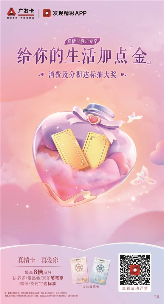 实体商业人气回暖,线上零售增势不减。线上线下共促激发消费活力,在今年迸发出新的势头。广发信用卡坚持把助力恢复和扩大消费摆在优先位置,不断强化消费信贷对消费的支持,深耕场景建设,加速多样化的服务供给,全力支持消费回暖。广发真情卡坚持20多年真情守护,近日再次服务升级,推出“给你的生活加点金”主题活动,为专属客群量身打造高倍积分、组团抽消费金、 “金”条礼赠等全新福利,以积分奖励促消费循环、以组团分享激发消费潜力,助力消费提振。