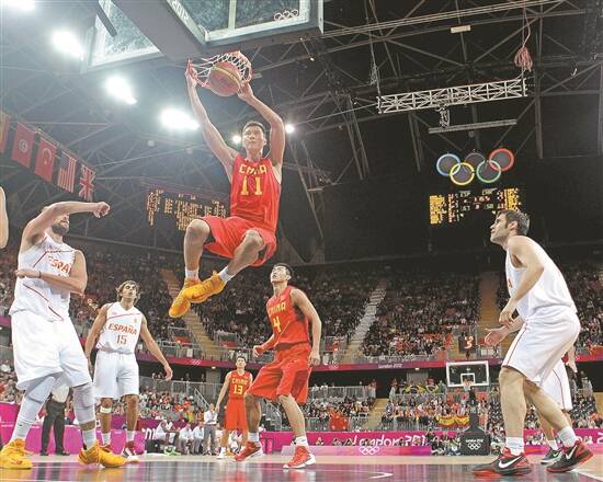 2012年伦敦奥运会男篮小组赛,易建联突破西班牙队防守完成灌篮 图/视觉中国