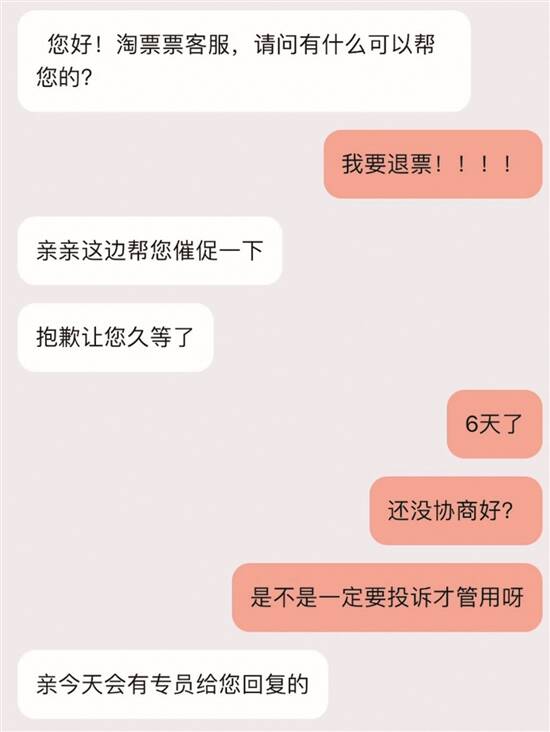 在致电电影院并取得退票同意后,王先生再度与淘票票App联系,这回,人工客服表示“客服人员也在加班加点跟进处理,会按照开场时间依次处理用户相关诉求”,但需要5天以内的等待时间。“打电话也是那几套话来回说,12315投诉他也不怕,客服回答就挺敷衍的。”王显示无奈地表示。