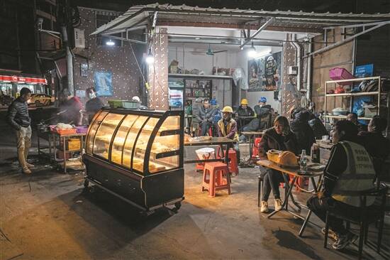 深夜,工人们在白云站旁的饭店内
