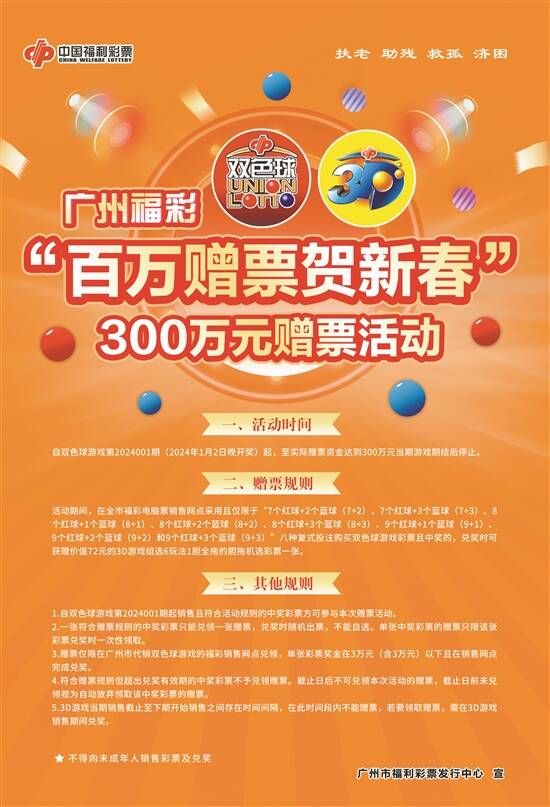 为真情回馈广大彩民朋友对双色球游戏的支持与厚爱,广州市福利彩票发行中心决定自双色球游戏第2024001期(1月2日晚开奖)起,在全市范围内开展“百万赠票贺新春”300万元赠票活动。据悉,本次活动是广州市首次开展购买双色球中奖送3D彩票的联动促销活动。活动期间通过指定的8种复式投注方式购买双色球游戏彩票且中奖的,兑奖时可获赠价值72元的3D游戏组选6玩法1胆全拖的胆拖机选彩票一张。