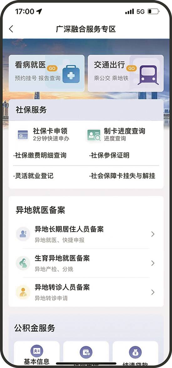 据介绍,广深融合服务专区提供异地就医备案、社保卡申领、社保参保证明、办理档案事务、公交乘车、户口迁移、城乡居民基本养老保险关系转移接续申请等服务。以“穗好办”APP为例,进入“深圳专区”,可以看到“个人办事”“企业办事”“人才服务”“民生服务地图”“文化生活”“深圳资讯”等板块。此外,还可快捷打开“医保电子凭证”“乘车码”“地铁线路”“警务地图”“医院挂号”等,全面考虑在深广州人的生活工作需要。