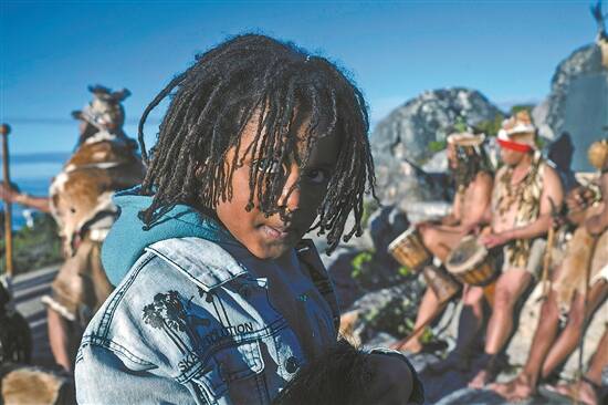 开普敦桌山石堆上,有几个土著人正进行着传统表演