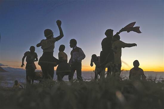 开普敦海边,许鸿飞与当地小孩一起迎着傍晚的夕阳余晖