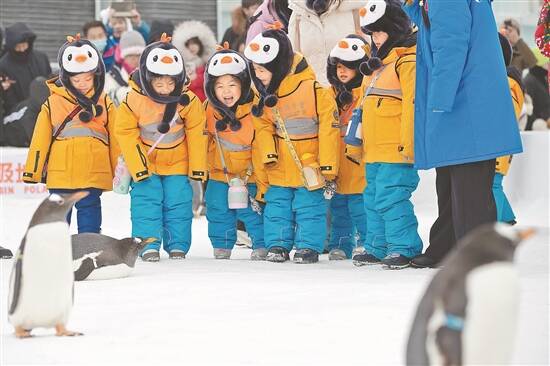 1月6日,11名来自广西南宁的小朋友——“小砂糖橘”结束漠河游学之旅,来到哈尔滨极地公园,与企鹅亲密互动 新华社发