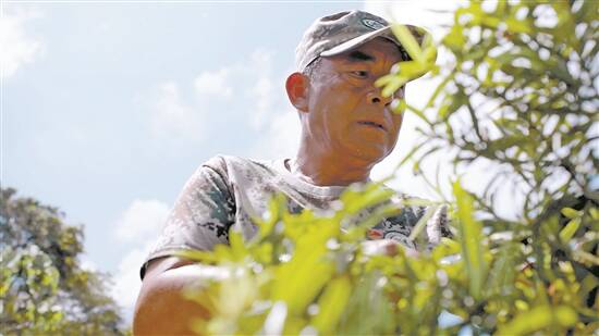 在罗汉松保护基地修剪杂草是他重要的日常工作之一