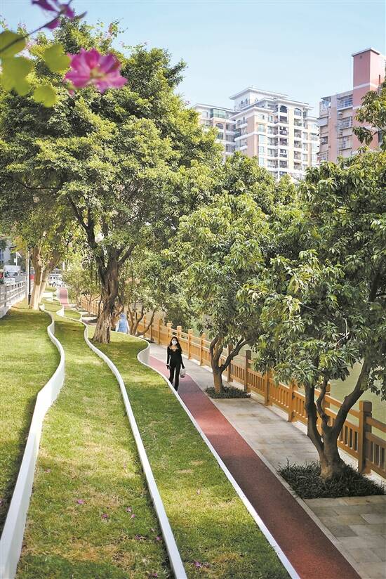 曲折结合的跑步道、漫步道在河涌两岸延伸,成为居民锻炼身体的好去处。曾经,跑步道、漫步道是人车混行的岸道,经过整治后,以绿化带隔离车道,为在漫步道、跑步道、人行道锻炼的居民提供安全保障。