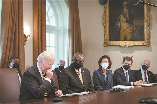 拜登(左一)6日晚与奥斯汀(左二)进行了“亲切友好的”交谈,对奥斯汀保持“完全信任”,并期待他返岗工作(资料图) 视觉中国供图