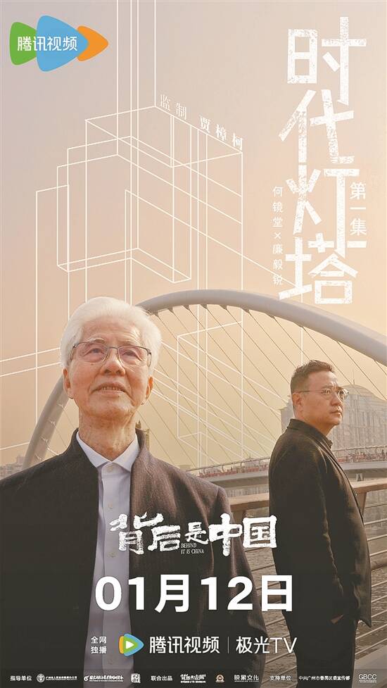 《背后是中国》第二季《我在大湾区 背后是中国》共有六集,自1月12日起每周五12时在腾讯视频陆续播出。在首映礼上,头两集《时代灯塔》《基因密码》率先与观众见面。在第一集《时代灯塔》中,建筑设计师、清华大学建筑设计研究院产业园区联合研究中心主任廉毅锐到广州拜访了中国工程院院士、建筑学家、教授何镜堂,两代建筑师共同探讨建筑背后的时代表达,分享不同时间里相同的家国情感。第二集《基因密码》中,华大集团CEO、基因组学研究员尹烨则拜访了国家生猪种业工程技术研究中心主任、华南农业大学教授、温氏食品集团研究院院长吴珍芳,两位专家细数中国基因工程的成长历程,感悟科技发展背后的中国式人文关怀。