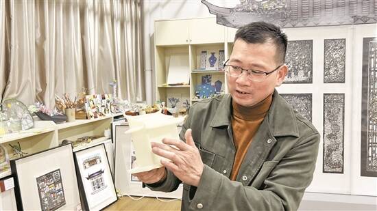 曾万春介绍剪纸作品采用的载体——潮汕特色古建筑“门楼”