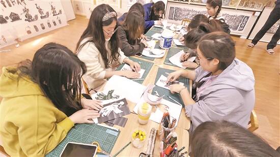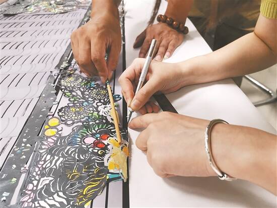 ▶师生在共同创作剪纸作品《潮风百韵·一剪千华》 受访者供图