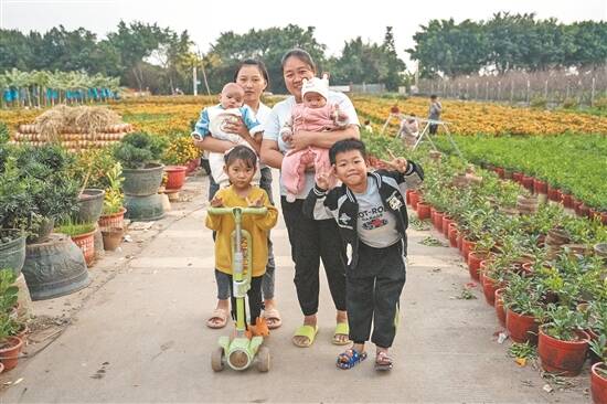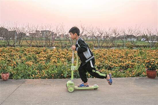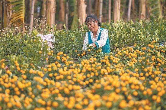 夕阳时分,广州市番禺区北斗大桥附近的都那村,一片片年桔树晒得金黄。农户吴大姐一边忙着捆扎年桔树,一边说:“年桔基本成熟了,把叶子绑起来就可以卖了。”谈及家中的情况,她的脸上透出幸福:“我有两个儿子两个媳妇五个孙子,全都住在这片年桔地里,儿子平日得闲时也会在田地里打理桔树,媳妇负责带孩子,孩子们可喜欢在这里玩了。”