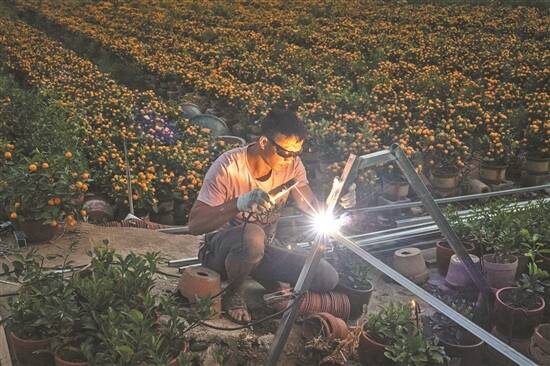 陈大哥在年桔地里自己动手焊接棚架