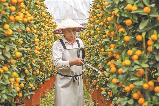 种植户吴大姐正精心修剪桔树