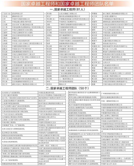 为表彰先进、树立典型,打造新时代卓越工程师队伍,强化国家战略人才力量建设,激励动员广大工程师奋进新时代、建功新征程,党中央、国务院决定,授予丁文红等81名个人“国家卓越工程师”称号;授予5G标准与产业创新团队等50个团队“国家卓越工程师团队”称号。