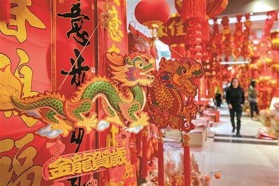 “含龙元素的福字、挂件,卖得最好。”在义乌从事年货生意的李炳长说,从2023年11月开始,生肖龙的商品热度就不断攀升,“我做年货生意20年了,今年行情是比较好的。”