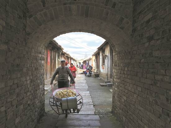 年味渐浓,江苏海门余东古镇老街上许多人家在蒸糕、蒸馒头,热气腾腾。一位大爷推着独轮小车置办年货,车上放着新蒸好的馒头,从石板街路走过,轱辘发出的响声,让人恍如回到从前。