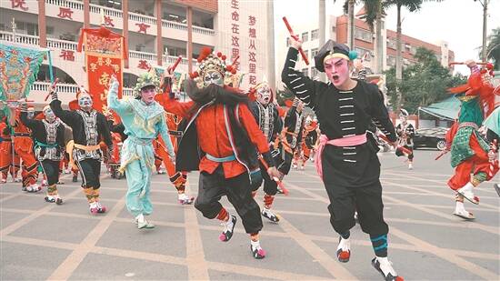 英歌舞在潮汕地区广为流行,过年时节,常可见英歌舞遍地开花,普宁更是将英歌舞跳得红火热闹。这种舞蹈融合了南派武术、舞蹈、戏剧等地方艺术,具有粗犷、威猛、阳刚、豪迈的特点,同时还有驱邪祈福的寓意,故而成为潮汕文化的代表性符号之一。