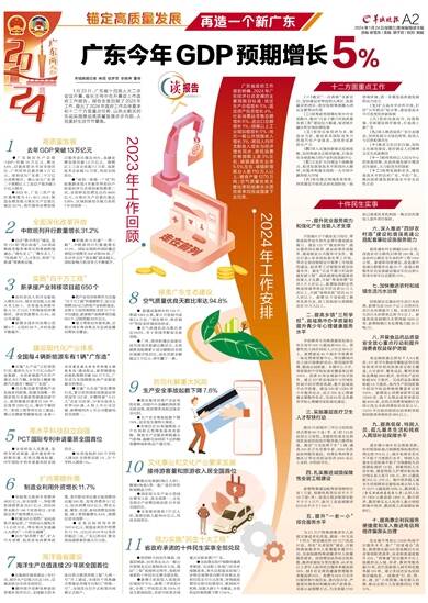 1月23日,广东省十四届人大二次会议开幕,省长王伟中在开幕会上作政府工作报告。报告全面回顾了2023年工作,提出了2024年政府工作总体要求和十二个方面重点任务,以热火朝天的生动实践推动高质量发展步步向前、人民美好生活节节攀高。