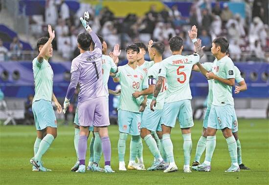 国足队员互相鼓励 新华社发