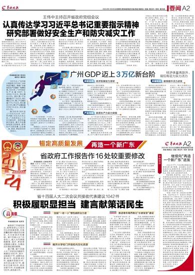 “再造一个新广东”,前进的方向清晰勾勒。2024年怎么干?省政府工作报告明确划出了十二项重点工作,扎扎实实推进高质量发展。比如,做实“一点两地”全新定位,更好发挥粤港澳大湾区支撑带动作用;推动“百县千镇万村高质量发展工程”建设加力提速,促进城乡融合和区域协调发展;坚持实体经济为本、制造业当家,建设更具国际竞争力的现代化产业体系;加快构建全过程创新链,打造具有全球影响力的产业科技创新中心……一项项工作紧扣高质量发展的需要,用实实在在的措施串起新的发展目标,对不断开创广东现代化建设新局面提出新期待。