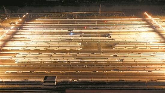 1月25日凌晨,在广州动车段广州南动车运用所,工作人员通宵对129组动车进行检修、保洁作业,一列列刚刚检修完的动车组排列整齐,停靠在存车线上,如同一支“陆地舰队”蓄势待发,即将服务春运。