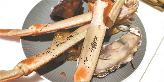 据了解,程女士是在1月中旬光顾的这家酒店,随行的还有多位朋友。“想着这家是‘五星级’酒店,一份海鲜自助餐要几百元,出品一定不错。”当天的自助餐品种不算少,在餐台上选了几种海鲜后,程女士和朋友就开启了边吃边聊模式。突然一位朋友惊讶地发现,盘中的蟹腿上,密密麻麻附着着许多黑色的圆形颗粒。