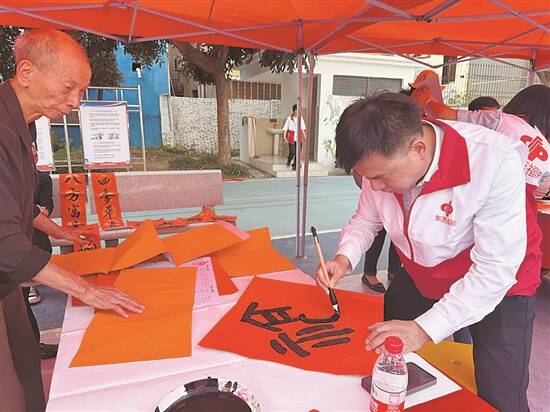 同时,福利彩票摊位通过福彩知识有奖问答、派发宣传品,让社区群众参与福彩公益互动活动,在活动中了解福彩公益金用途、公益金资助项目等情况。在写春联的摊位前,东莞市福彩中心安排了15名志愿者与书画爱好者一起配合,把承载着对新年美好愿景和诚挚祝福的“福”字和春联,送到社区群众手中。