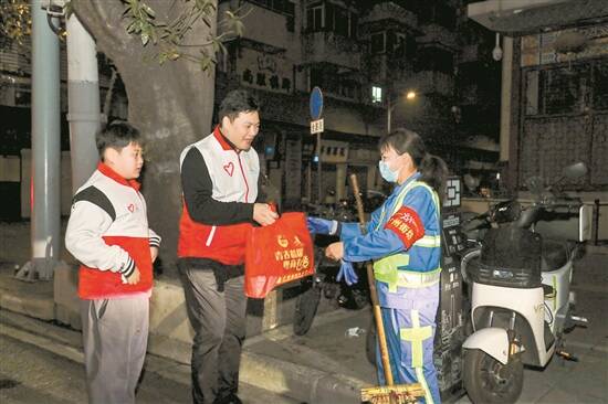凌晨4点,记者跟随身着马甲的志愿者服务队分队走入街头,沿途为正在作业的环卫工人们送上装满生活日用品、糖果、腊味年货的情暖礼包,送上一声声暖冬的祝福。