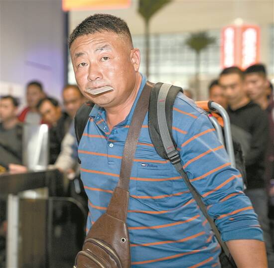 2月2日,广州白云站,一位旅客因双手要提行李,全身上下连嘴都没闲着 羊城晚报记者 蔡嘉鸿 摄