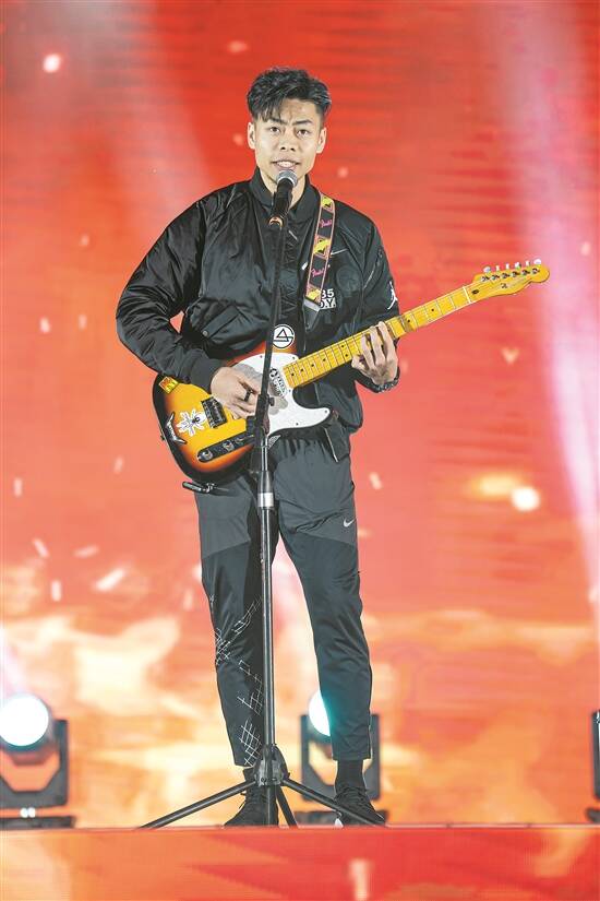 杭州亚运会田径男子4×100米接力金牌得主陈冠锋一身黑衣,斜挎一把色彩绚丽的吉他,与田径中心的小伙伴们临时夹“BAND”(乐队),激情献唱一首Beyond金曲《我是愤怒》,摇滚范十足,炒热全场气氛。