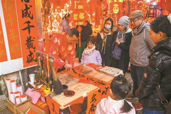春节即将来临,广东江门三十三墟街区到处洋溢着浓浓的节日气氛,各种应节商品琳琅满目。在一家出售春联的小商铺门前,书法家正在写春联,吸引了众多路人围观。