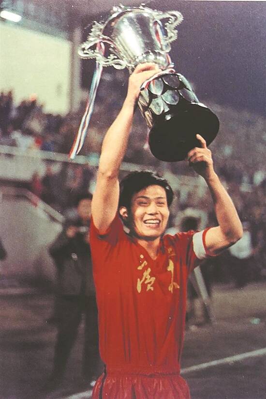 王惠良在第六届省港杯以广东队队长身份捧起冠军奖杯 广东省足协供图