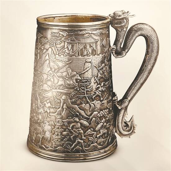 9.银锤鑠錾刻“三英战吕布”龙柄马克杯