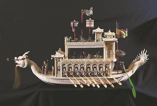中国的龙船文化中,龙象征着威严、力量和智慧,而船则象征着希望、和平与繁荣,龙船与牙雕技艺的结合,蕴含了人们对生活一帆风顺、富强康乐、才望兼隆的美好祝愿。该象牙船又称八仙贺寿牙雕龙船,是当年为庆贺慈禧太后40寿辰而制作的贡品,长93厘米,高53厘米,于清朝同治年间在广州制造。楼船共三层,船体用象牙片拼装而成,镶有少量铁和贝壳等材料。