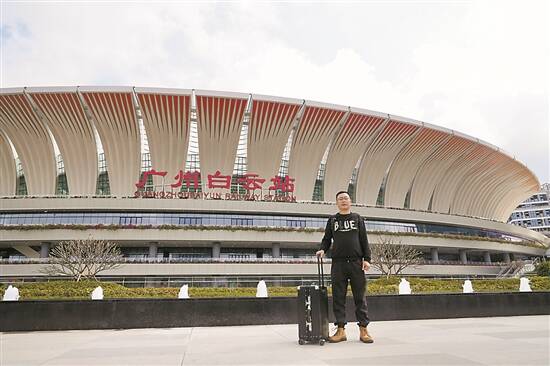 连续阴沉了几天的广州终于在中午洒下了一点阳光。近日,聚在广州白云站(以下简称“白云站”)西广场前的游客更多了,他们趁着光线好,争相跟身后的白云站合影。在众多合影旅客中,一位中年大哥显得尤为激动。