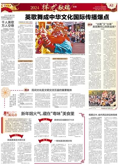 羊城晚报讯 记者黎存根、通讯员粤文旅宣报道:2月14日(年初五),春节假期虽已过半,广东各地群众出游热情依旧高涨,全省文旅市场畅旺持续。据初步测算,年初五,全省纳入监测的150家重点景区接待游客284.8万人次,同比增长30.5%(以下均按可比口径,下同),较2019年增长2.5%。多个景区负责人表示,当下正值省内周边游高峰,度假产品预订火爆,“请到广东过大年”宣传效果明显拉动外地游客前来旅游消费,港车北上游客成为增色亮点。同时,文化产品供给推陈出新,各地市民游客乐享新春文化大餐。