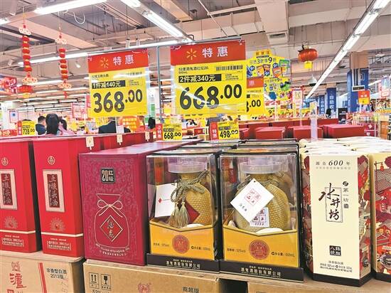相对于能储存的食材,白酒的销售旺季不在于春节期间,而在于之前的一个月。无论在商超,还是在烟酒行,各种喜庆的酒产品堆头都摆在显眼的位置,很多包装以红色为主,有些还打出让利优惠、买二送一等促销口号,配以龙年的设计符号。