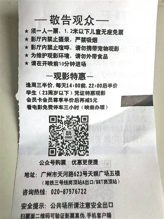 广州天河电影城的电影票背面有“禁止摄录”的提醒
