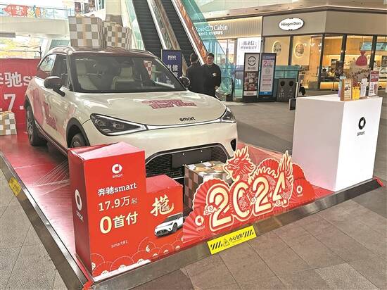 在山姆超市入口旁,一辆奔驰车展示在庭前空地,其中“奔驰smart 17.9万起0首付”的展板吸引了不少人驻足观看。该汽车门店的工作人员表示,“汽车的价格比较固定,春节期间没有特别大的优惠。特别是新能源车,主要按照订单来生产,有需要就买,感觉没有特别大的旺季或者淡季。”