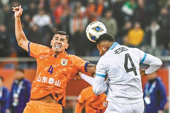 山东泰山队球员贾德松(左)在比赛中争顶 新华社 发