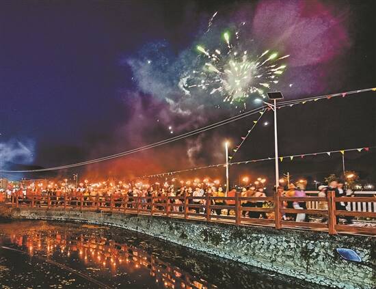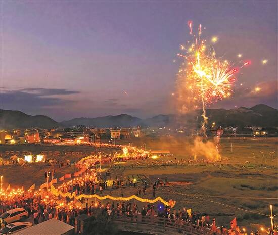 追龙期间,烟花、鞭炮伴随着火炬龙一路行进,村民们喜迎火炬龙的到来,祈盼今年风调雨顺、丁财两旺。