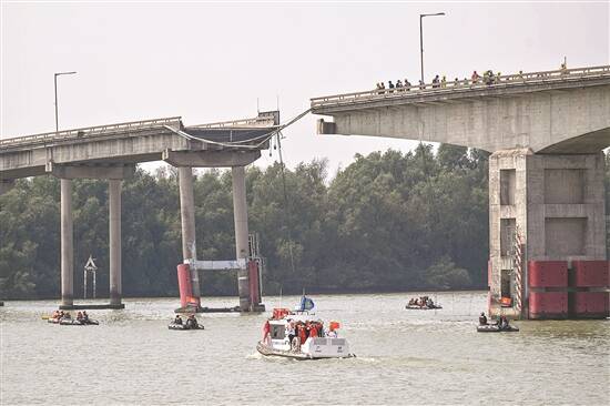 记者在事故现场看到,一根被撞桥柱的倾斜角度约为15度。现场有中国铁建大桥局的工作人员受邀勘察探讨桥梁修复方案,该局工作人员向记者透露,有同事在桥上进行了勘探,下一步或采用搭便桥的方式先恢复通行。