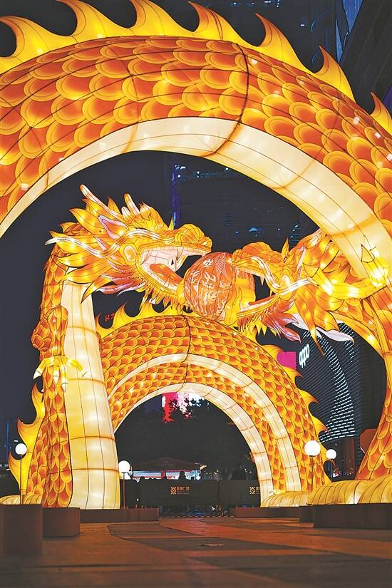 春节期间,广州越秀公园内美轮美奂的花灯营造“火树银花不夜天”的广府年景,吸引游人如织。夜幕中,长达100米的巨龙随光影而动,色调变幻间尽显“龙行天下”的英姿气魄,点缀湖面的既有传统岭南元素的莲蓬、年橘、红木宫灯等造型灯组,更有恐龙、水母、鲸鱼等互动装置,吸引大批游客驻足拍照。