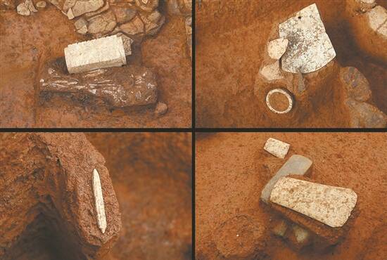 岩山寨遗址随葬玉器出土现场(玉琮、玉钺与玉环、玉锥形器)