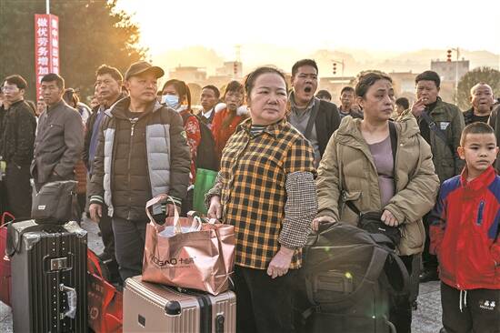 榕江站外,返岗的务工者在广场集结等待进站