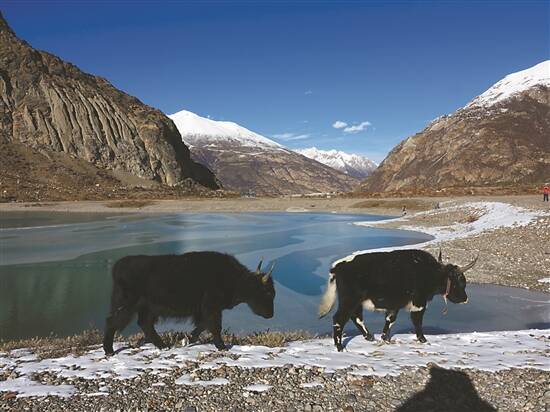 我们先到三色湖景区,驾车可停至景区临近登山观湖栈道的停车场。从三色湖再前往祥格拉冰川,目前却只能沿着简易的砂石路慢慢走。